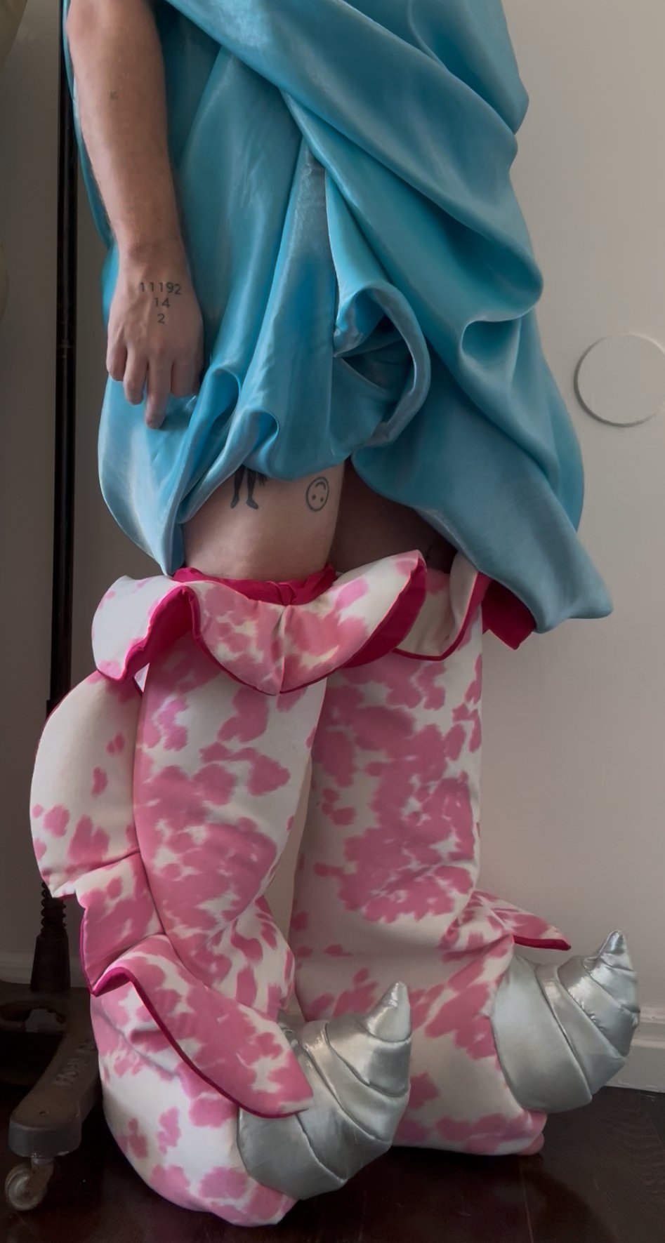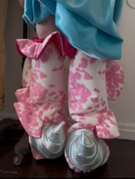 Boot covers/ leg warmers- foam and vinyl with poly dupioni liner- elastic back fits up to 26” thigh, 30” inseam