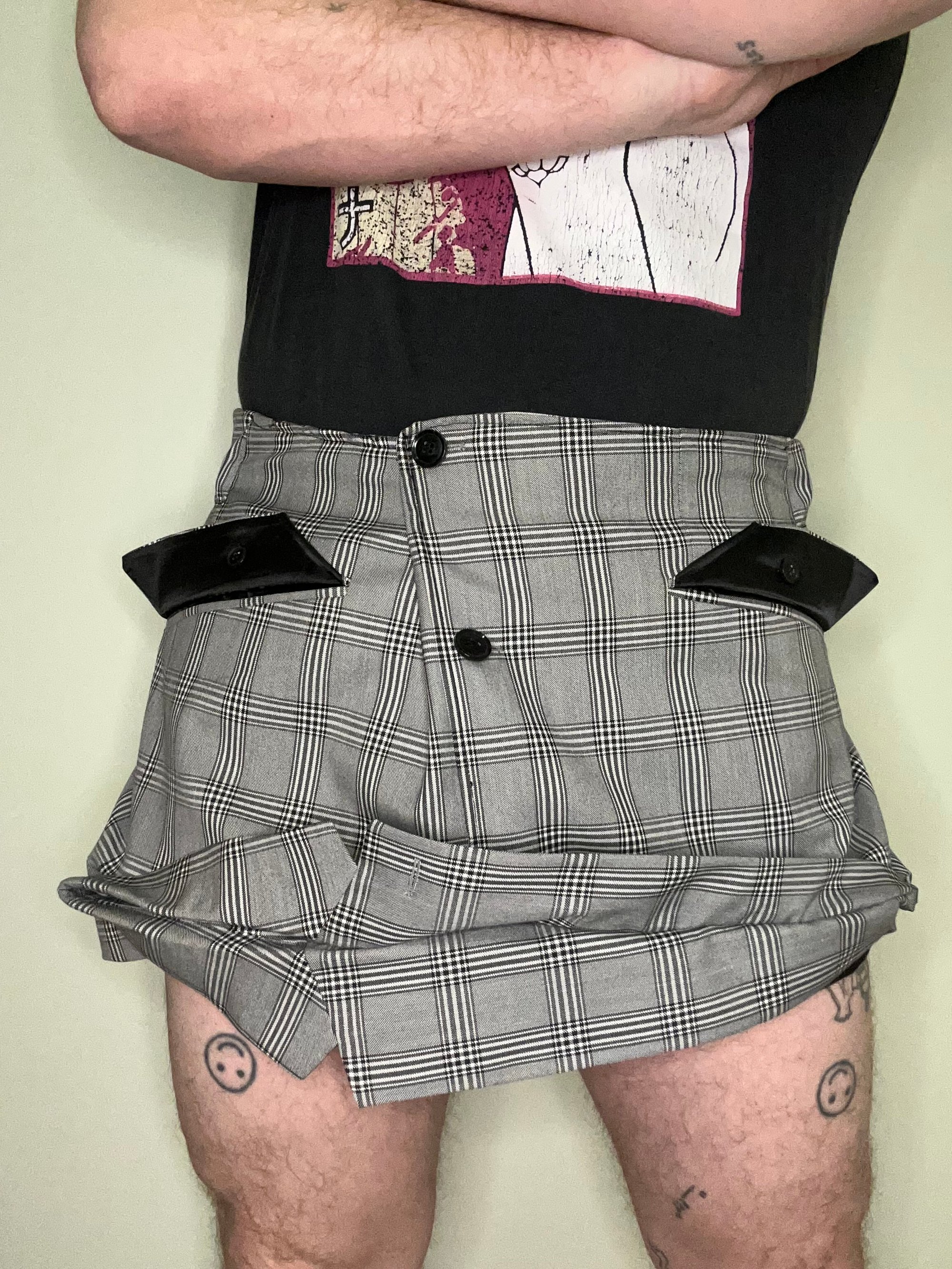 One of one up cycled blazer skirt- interior and exterior pockets, elastic waistband, size 32-36
