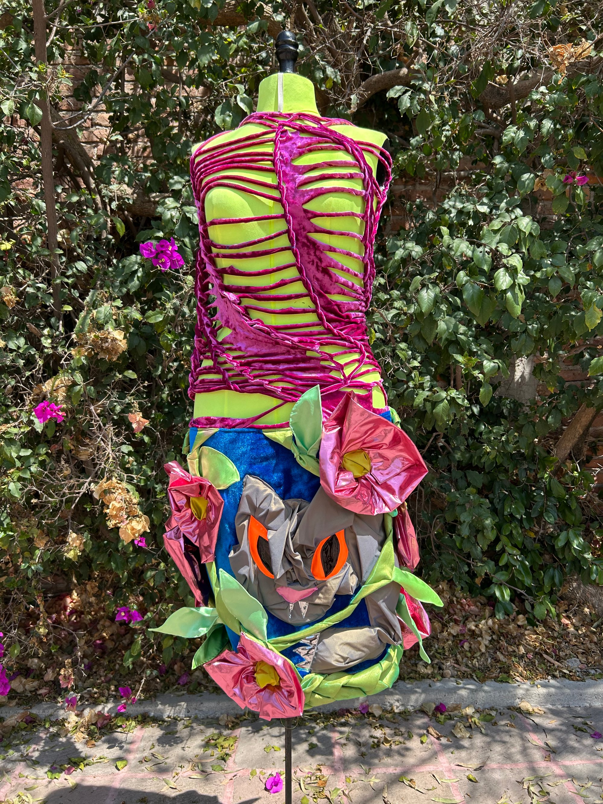 One of one 3D appliqué dress with Lycra braided top detail and large lobster claw clasp closure waist is 40”
